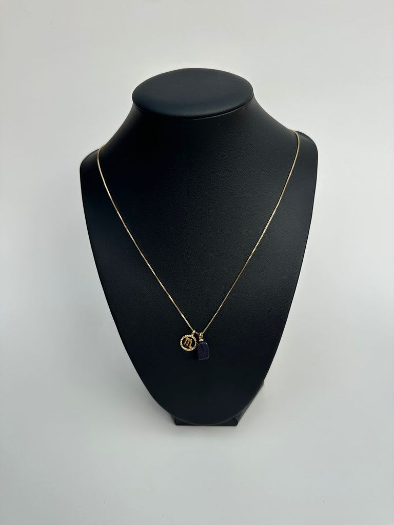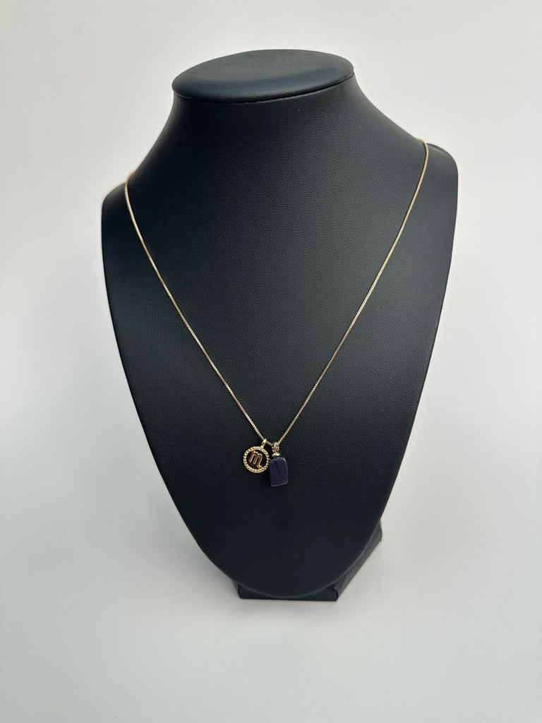 Properties of Sapphire is that it creates a energetic shield and strengthens emotional stability permits equilimbrium and good well being. The chain has a 18k gold wash.