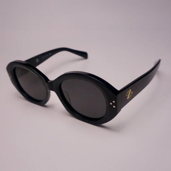 Black Oval style sunglasses, with gold detailing. UV protection on lense. Retro-chic style sunglasses. Made in Italy
